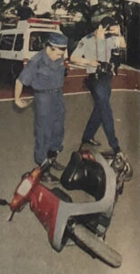 1994年、8月2日の深夜1時40分、原付バイクで東京都新宿区の安鎮坂付近を走行中、ガードレールに激突し大規模なバイク事故を起こしました。